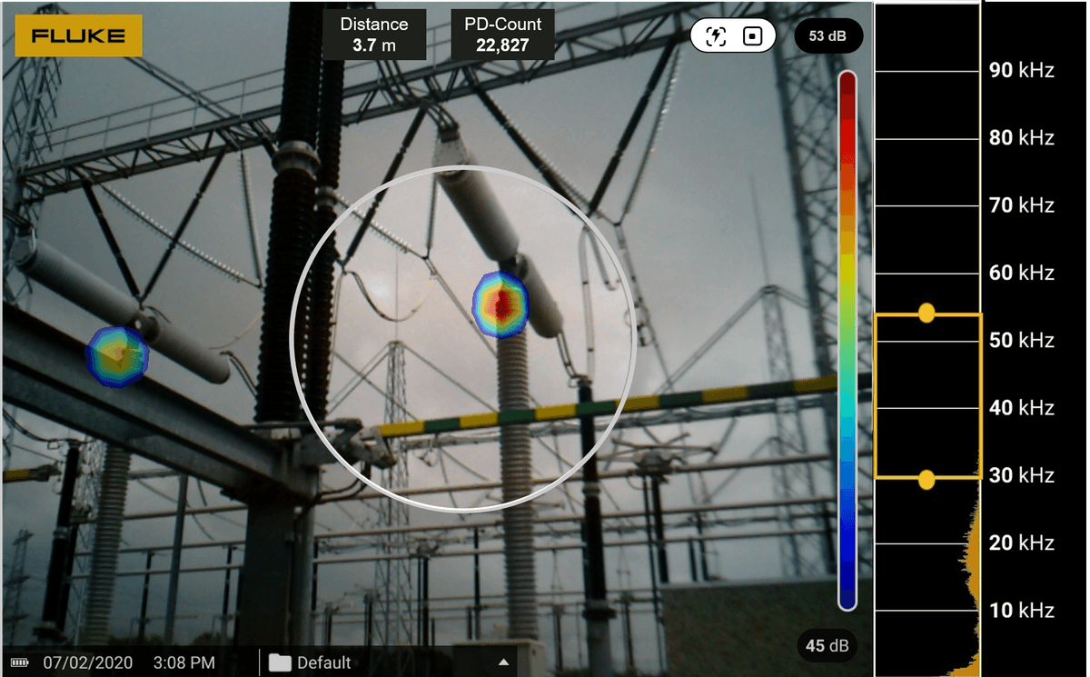 Mit Hilfe einer revolutionären neuen Technologie zur Isolierung der unterschiedlichen Schallfrequenzen von Teilentladungen aus einer sicheren Entfernung von bis zu 120 m können Techniker jetzt umfassende Inspektionen durchführen, ohne sich Sorgen um ihre Unversehrtheit machen zu müssen. Vom sicheren Boden aus, weit außerhalb der Gefahrenzone, können Techniker nun bequem das Gerät auf das Objekt richten und sofort sehen, wo eine Teilentladung auftritt, bevor diese sich in potenziell gefährliche Situationen begeben.